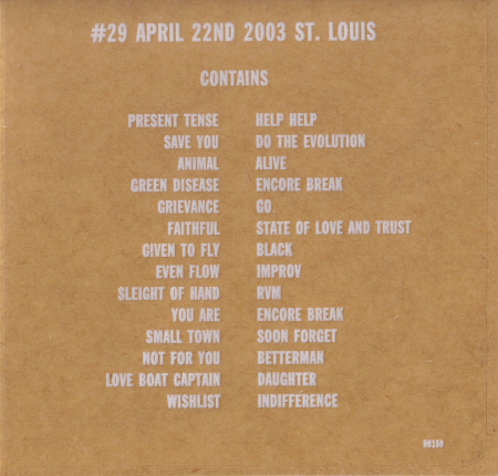 | Disc 1 1. Present Tense 2. Save You 3. Animal 4. Green Disease 5. Grievance 6. Faithful 7. Given To Fly 8. Even Flow 9. Sleight Of Hand 10. You Are 11. Small Town 12. Not For You 13. Love Boat Captain 14. Wishlist 15. Help Help |